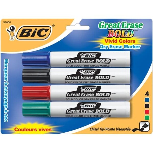 MMVI BIC-Great Erase Bold Dry Erase Markers. These dry erase markers feature bright colors; low odor and work perfect on whiteboards; glass; metal and most other non-porous surfaces. Great for school; home and the office. This package contains four chisel tip markers: black; blue; green and red. Contents conform to ASTM D4236. Made in USA.