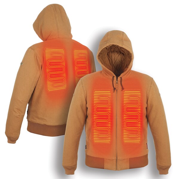 The Fieldsheer powered by Mobile Warming heating technology Bluetooth-enabled 12-volt Foreman Heated Jacket is a work jacket with classic looks and a heavy-duty fabric construction. Designed for ranchers, construction workers, linemen, or anyone who works outside for extended periods in the cold. The Foreman is constructed of a heavy-duty 5 oz 100% Cotton Canvas Outer Shell with a thermal-lined hood with a drawcord closure to keep the wind out and an anti-static 3 oz polyester soft touch quilted polyester full-sleeved thermal liner. This jacket has rib knit cuffs and waist, heavy-duty zippers, an interior zippered pocket, an interior hook & loop pocket, and 2 large hand pockets. The Foreman’s heating system is powered by a long-lasting 12-volt Lithium-Ion battery, featuring a USB port to charge your mobile devices and a powerful built-in LED flashlight. This jacket has 4 large heating panels, 2 in the chest and 2 on the back. It can provide heating temperatures ranging from 135°F on high to 90°F on low. On high, expect up to 2.8 hours of heat. On low, the Foreman can heat up to 11 hours. There are 2 ways to adjust the temperature. First, the built-in touch control button is a simple button push that allows you to choose from 4 heat settings with LED indicator. Second, you can use the incorporated Bluetooth control with the MW ConnectTM app. Through the free MW ConnectTM app, you can adjust individual heat levels to your liking. MW ConnectTM allows you to get real-time updates on battery levels and update your garments when new firmware becomes available. The Foreman comes as a complete package with a 12V (5200 mAH) lithium-ion battery and an AC charger. You can get up to 11 hours of power per charge.