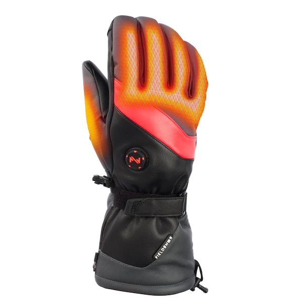 The Slope heated gloves are constructed of a waterproof Hybrid Goatskin Leather and polyester shell with 100% soft polyester fleece liners. They feature an anti-slip palm, touch screen compatility, a wrist loop, a gauntlet cinch closure and a pull-on glove loops. With a touch of a button, you can select from four different temperatures, ranging from 135°F on high to 90°F on low. On high, expect up to 2.2 hours of heat and on low for up to 8 hours, keeping your fingers and top of your hands warm. Includes 2 7.4V (2200 mAh) rechargeable Lithium-Ion batteries and a AC charger. You can expect up to 8 hours of heat per charge.