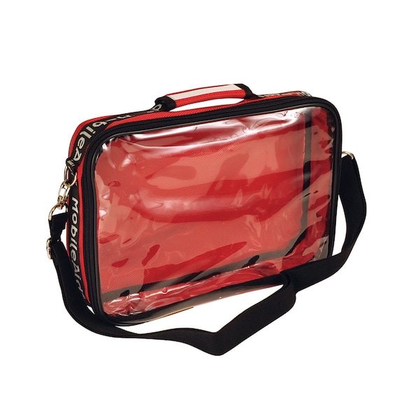 An Over-The-Shoulder (OTS) clear-view ballistic nylon pouch designed to provide hi-visibility identification, easy hands-free carrying, and quick access to emergency supplies. This super-durable pouch is made of weather and wear resistant ballistic nylon with a full internal vinyl liner for protecting contents and ensuring years of use. Clear vinyl lid makes supplies clearly visible. Shoulder strap adjustable and removable.