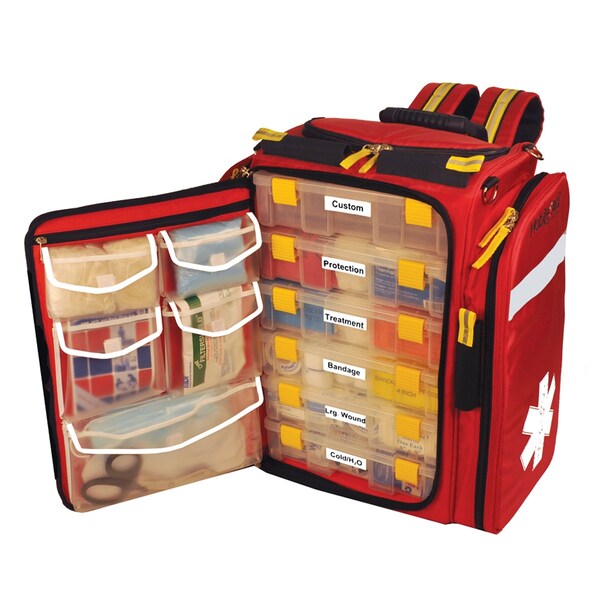 Comprehensive 260-piece emergency trauma first aid backpack kit that includes 6 Quick-Access first aid supply modules and a flexible stretcher, OSHA & ANSI compliant. High-capacity trauma First Aid 4-way-carry backpack: backpack, shoulder strap, hand straps, ride on MobileAid rolling stations. Super-rugged ballistic nylon. Hi-visibility markings and 24 pre-printed and customizable ID placards. CONTENTS: (1) First Aid guide book (1) Writing tablet (1) Pen (1) evacuation stretcher (1) Scissor utility shears 7-1/4" (1) CPR filtershield adult/child (1) Instruction and inventory sheet (1) document pouch (1) First Aid flag and pole (2) Face mask with eyeshield (2) Vinyl gloves (pairs) (2) Protective gown (2) incident blanket (2) Aluminum splints (24" x 4 1/4") folded (1) First Aid instructions (1) Bandage scissors 5 1/2" (1) Splinter forceps 4 1/2" (1) Kelley forceps 5 1/2" (1) Penlight (1) Hand sanitizer (4 oz) (1) Sunblock SPF 30+(4 oz) (1) Insect repellant (2 oz) (2) Emergency blankets (2) Vinyl gloves (pairs) (4) AA batteries (10) Instant towels (12) Bio-hazard bag (25) Aspirin (2 5-grain tablets) (1) Hydrogen peroxide solution (4 oz spray) (2) Sting & Bite swab (2) Eye wash 1 oz sterile (3) Vinyl Gloves (pairs) (3) Emergency water pouches (4oz) (10) Burn gel 0.9gm packets (10) Triple antibiotic packs 0.5gm (10) PVP iodine swabs 1/2cc each (10) Wound cleaner towelette (12) Cotton tip applicator 3" (14) Hydrocortisone 1% 1/8 oz foil pack (1) Compress bandage 4" with telfa pad (1) Bloodstopper bandage (1) Triangular bandage 40" x 40" x 56" w/ safety pins (1) adhesive tape 1" x 5 yards (2) adhesive tape 1/2" x 5 yards (2) 2" x 6" gauze bandage (2) Co-Flex bandage 2" x 5 yards (4) Eye pads with adhesive strips (6) Non-adherent pad 2 x 3" (6) Gauze clean-wrap bandage 2" (8) Gauze pads 3" x 3" 12 ply (10) Plastic 2" x 3" patch bandage (10) Woven knuckle bandage (16) Bandage strip 1" x 3" (16) Butterfly closure (medium) (1) Bloodstopper bandage (1) Waterproof adhesive tape 1" x 5 yards (2) ABD combine pad 5" x 9"(2) Burn dressing gel-soaked 4" x 4" (2) Sterile gauze roll 4 1/2" x 4.1 yards (4) ABD pads 8" x 10" sterile (3) Emergency water pouches (4oz) (4) Cold pack unit 5" x 6" Dimensions: External dimensions: (16"W x 19"H x 10.5" deep) Internal dimensions (main compartment): (12"W x 17"H x 9"D) 2 side compartments: (2"W x 17"H x 10"D) Front access door: (11"W x 16"H) Top Access door: (9.5"W x 7"H) Weight: 26 lbs.