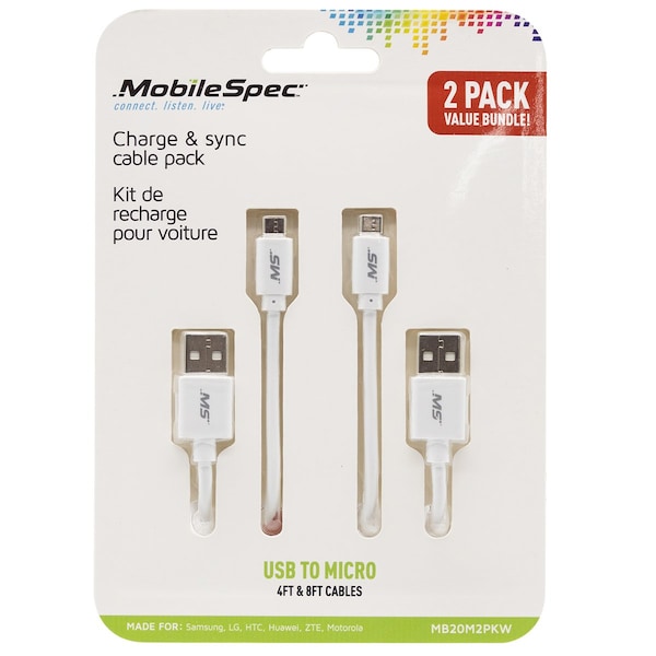 Safely charge and sync your compatible Micro to USB devices with this cable two pack. Perfect for at home and in the car.