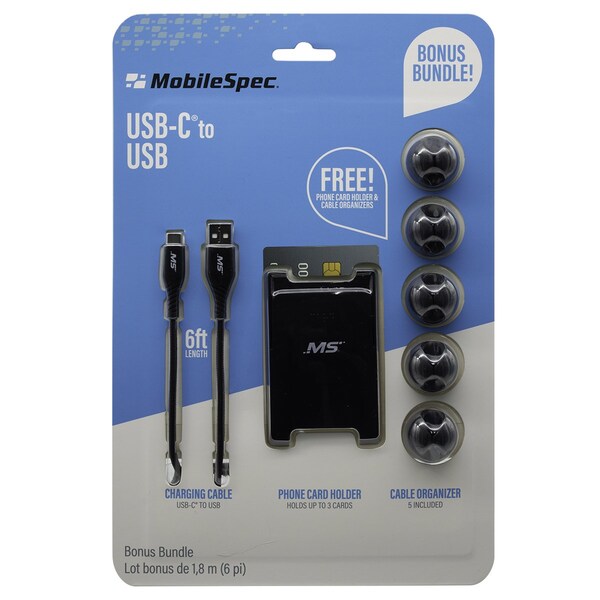 This value pack includes a USB-C(TM) to USB cable 5 cable organizers and an adhesive phone card holder. The cable features a black braided cord for added strain relief.