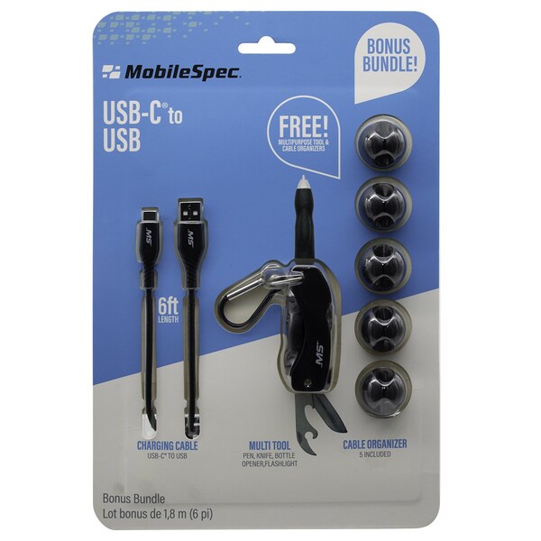 This value pack includes a USB-C(TM) to USB cable 5 cable organizers and a multi-purpose tool. The cable features a black braided cord for added strain relief.