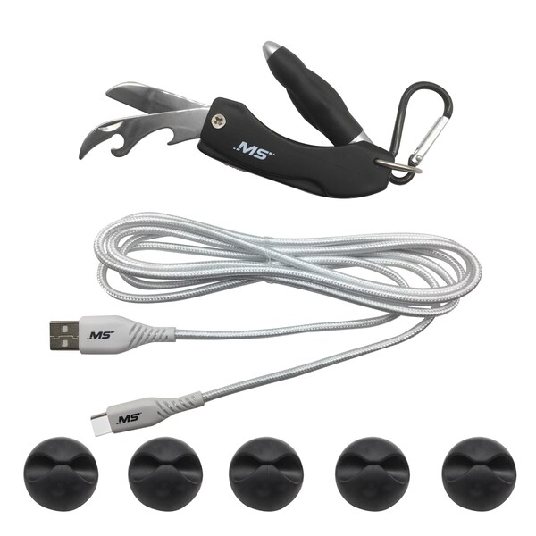 This value pack includes a USB-C(TM) to USB cable 5 cable organizers and a multi-purpose tool. The cable features a white braided cord for added strain relief.