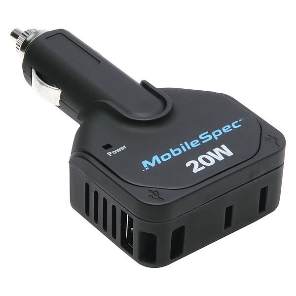 Inverter, Features Direct Plug, Output Form Modified Sine Wave, DC Connection Cigarette Lighter Input, Continuous Output Power 20 W, Peak Output Power 40 W, Number of Outlets 3, Input Voltage 12V DC, Output Voltage 115V AC, Output Frequency 58 to 62 Hz, Overall Depth 1 1/4 in, Overall Height 5 3/4 in, Overall Width 4 3/4 in, Outlet Type 2-Prong Outlet, Number of Standard USB Ports 1, Case Material ABS PVC, Includes Dual Ports: Standard USB 2.4 A and USB-C 3.0 A Ports, Number of USB-C Ports 1