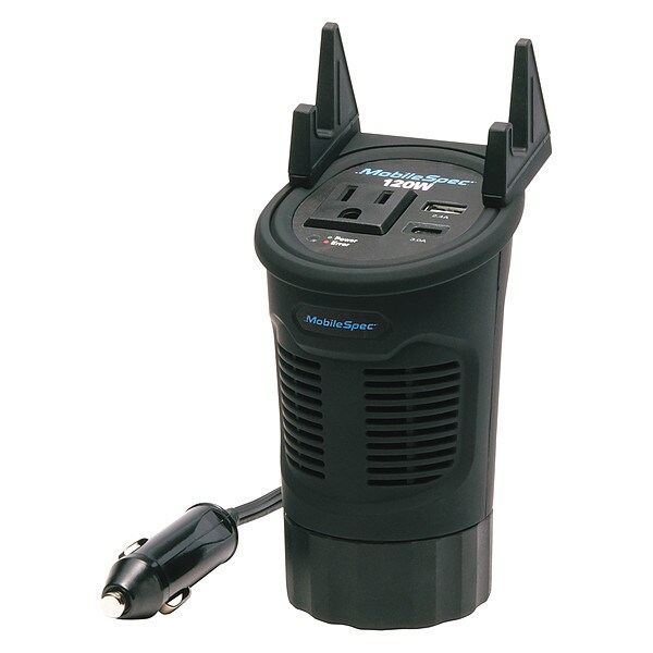 Inverter, Features Fits Securely Into Vehicle Cup Holder, Unique Cup Design, Output Form Modified Sine Wave, DC Connection Cigarette Lighter Input, Continuous Output Power 120 W, Peak Output Power 240 W, Number of Outlets 3, Input Voltage 12V DC, Output Voltage 115V AC, Output Frequency 58 to 62 Hz, Efficiency 85 Percent, Overall Depth 3 in, Overall Height 5 3/8 in, Overall Width 3 1/4 in, Outlet Type Standard 3-Prong Outlet, Number of Standard USB Ports 1, Case Material ABS PVC