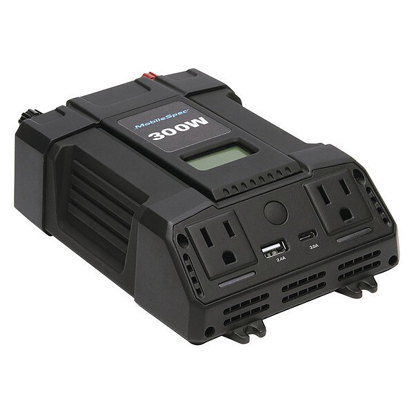 Inverter, Features LCD Display Screen, LED Fault Indicator, Output Form Modified Sine Wave, DC Connection Battery Clamps; Hardwired, Continuous Output Power 300 W, Peak Output Power 600 W, Number of Outlets 4, Input Voltage 11 to 15V DC, Output Voltage 115V AC, Output Frequency 58 to 62 Hz, Efficiency 85 Percent, Overall Depth 7 1/8 in, Overall Height 2 1/4 in, Overall Width 5 1/4 in, Outlet Type Standard 3-Prong Outlet, Number of Standard USB Ports 1, Case Material ABS PVC
