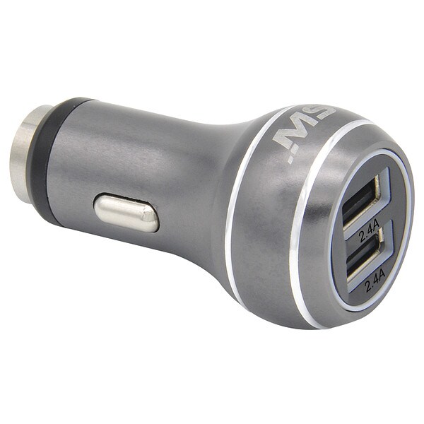 USB Car Charger, Power Requirement 12V DC, Number of Output Connectors 2, Color Gray, Max. Output Current 4.8 A, Output Voltage 5.0V DC, Output Connection Type (1) USB 2.0 Type A Female, For Use With USB Powered Devices, Overall Height 1.3 in, Overall Width 1.3 in, Overall Depth 2.56 in, Indicator (1) LED Power On, Standards CE, FCC, RoHS, Max. Operating Temp. 95 Degrees F, Min. Operating Temp. 32 Degrees F