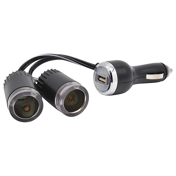 USB Car Charger, Product Type Power Splitter and Charger, Number of Connections 3, Cord Length 4 in, Color Black, Ports USB, Includes 4 in Cord, For Use With Devices Cell Phones, Portable Devices, Tablets, Current 2.4 A, Features Usage Up to 3 USB Devices Simultaneously, Operating Voltage 12V DC, Overall Depth 1 1/2 in, Overall Height 9 in, Overall Width 4 13/16 in