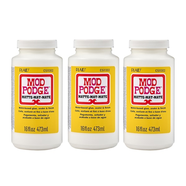 For over 55 years Mod Podge has been America's favorite glue, sealer, and finish. Mod Podge Matte is quick-drying and dries clear, leaving a smooth, matte finish. Preserve the beauty of your decoupage paper projects and more with this multi-purpose, all-in-one sealant, glue, and finish. Use this decoupage glue to create decoupage tissue paper projects as well as projects using wood, fabric, plastic, and canvas! This handy decoupage glue comes in a variety of finishes such as gloss, matte, glitter, satin, outdoor, dishwasher safe, and many other unique formulas for every project. Let your creativity come alive with the limitless possibilities of Mod Podge Matte. Sold as a pack of three 16 oz. bottles.