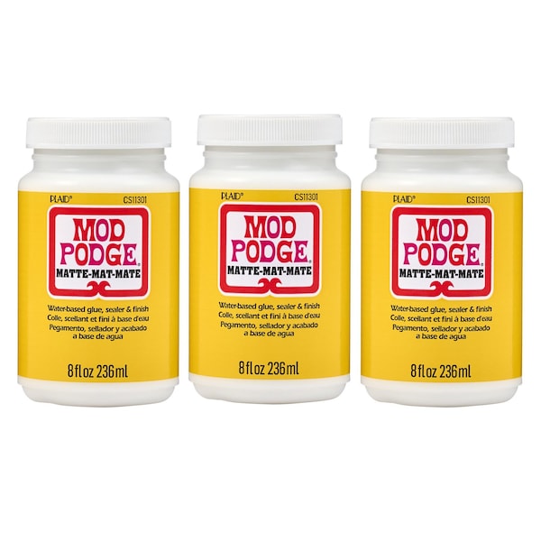 For over 55 years Mod Podge has been America's favorite glue, sealer, and finish. Mod Podge Matte is quick-drying and dries clear, leaving a smooth, matte finish. Preserve the beauty of your decoupage paper projects and more with this multi-purpose, all-in-one sealant, glue, and finish. Use this decoupage glue to create decoupage tissue paper projects as well as projects using wood, fabric, plastic, and canvas! This handy decoupage glue comes in a variety of finishes such as gloss, matte, glitter, satin, outdoor, dishwasher safe, and many other unique formulas for every project. Let your creativity come alive with the limitless possibilities of Mod Podge Matte. Sold as a pack of three 8 oz. bottles.