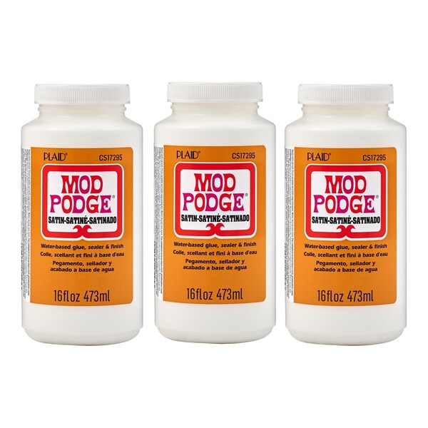 For over 55 years Mod Podge has been America's favorite glue, sealer, and finish. Mod Podge Satin is quick-drying and dries clear, leaving a smooth, satin finish. Preserve the beauty of your decoupage paper projects and more with this multi-purpose, all-in-one sealant, glue, and finish. Use this decoupage glue to create decoupage tissue paper projects as well as projects using wood, fabric, plastic, and canvas! This handy decoupage glue comes in a variety of other finishes such as gloss, matte, glitter, outdoor, dishwasher safe, and many other unique formulas for every project. Let your creativity come alive with the limitless possibilities of Mod Podge Satin. Sold as a pack of three 16 oz. bottles.
