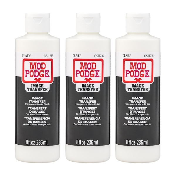 Use Mod Podge Clear Image Transfer Medium to personalize all your DIY projects. Use photocopies of your favorite photos and artwork to create unique arts and crafts on wood, glass, metal, canvas and more with Mod Podge Clear Image Transfer Medium. Photos must be printed on a laser, dry toner printer. This formula is a water-based, non-toxic medium that provides the ability to transfer any photocopied image onto a variety of surfaces without creating a paper halo around the transferred image. For best results, use on hard surfaces. Once your image is transferred, you will be able to clearly see your surface, compared to Mod Podge Photo Transfer Medium that transfers everything, including the background color. This formula works great on light colored surfaces. Mod Podge Clear Image Transfer Medium dries to a clear, matte finish - perfect for all your arts and crafts! Make Mod Podge Clear Image Transfer Medium a must-have formula in your decoupage art supplies. Sold as a pack of three 8 oz. bottles.