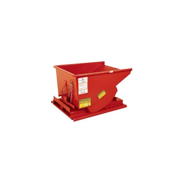 Versatile hopper is excellent for handling heavy, bulky scrap. forklift hoppers are useful for moving castings, wood and metal chips, recyclables and sludge. Rugged, fully welded hopper is precisely balanced to tip forward for complete discharge of contents and automatically return to the upright position when empty. Positive locking latch helps prevent accidental dumping. Unit features a watertight interior and can be used for wet or dry loads. 2 formed top lips increase rigidity and eliminates sharp edges. Extra-deep fork openings allow for easy forklift entry and unit includes a safety chain to ensure the hopper is secured to the forklift. Interlocking guides allow empty units through 2 cubic yard size to be stacked up to 3 high for space savings do not stack when loaded. Durable enamel finish and ships assembled.