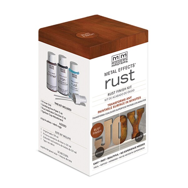 Transform any paintable surface into a beautiful rust finish in minutes. This kit includes primer, oxidizing iron paint, rust activator solution with a spritzer cap.