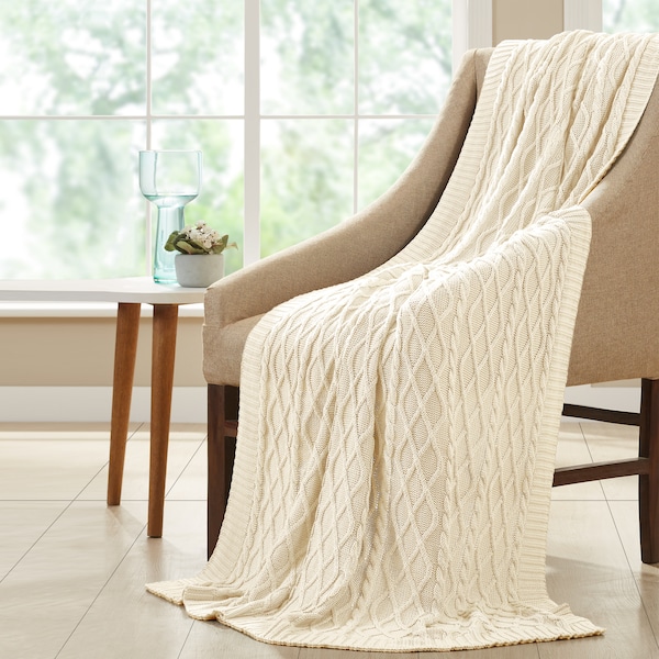 100% Cotton Oversized Cable diamond knit throws Antique White (Discontinued)