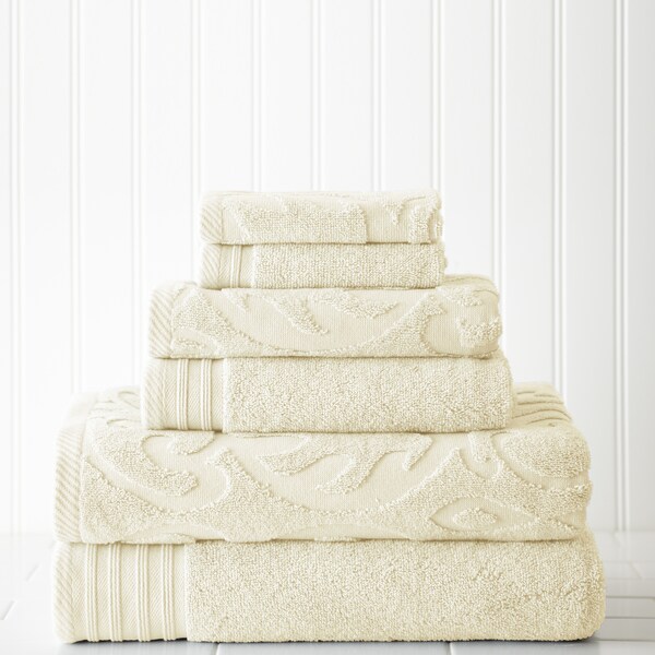 Indulge yourself in spa like luxury with this luxurious six-piece towel set. The set is made of cotton known for its softness, absorbency, and durability. These towels make an ideal complement to any bathroom whether you use it to pamper yourself or reserve it for special guests. cotton fibers are valued for their superior length and strength, which also reduces the buildup of pile and lint. These Medallipon Swirl Jaquard towels will feel cozy and comfortable against your skin every time you use them. Additionally the towels get softer with washing and drying. Bath- 27" x 54", Hand- 16"x28", Wash- 13"x13"