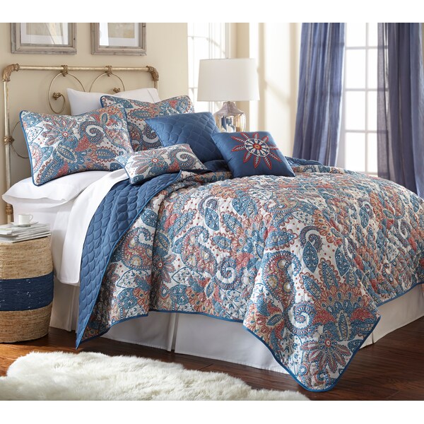 Brighten up any bedroom with this colorful quilt set. The set includes a quilt, two shams and three pillows for a totally harmonized design. Mix and match the solid and patterned pillows against the solid or patterned side of the reversible quilt to create different coordinated looks. Made of 100 percent polyester, the quilt is machine washable for easy cleaning.