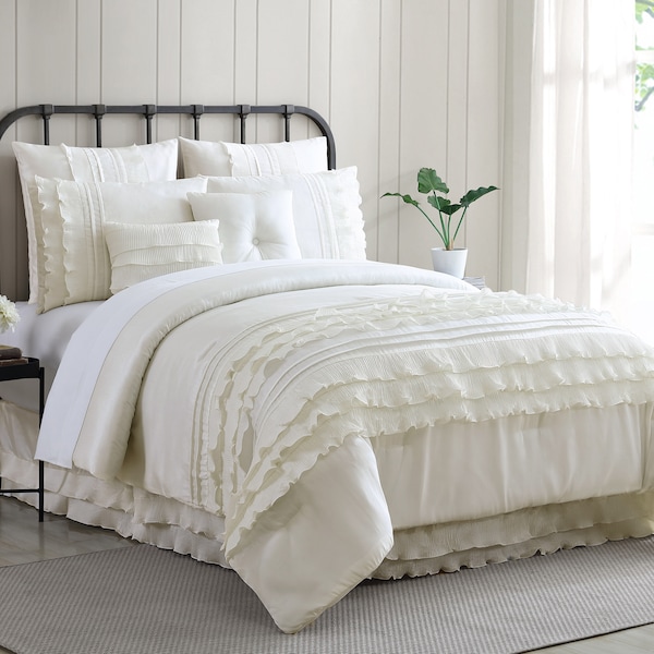 Update your bedroom with this soft and attractive eight-piece comforter set. The polyester filling gives just the right fluffiness to this comforter set while the bar tacking details give a more formal finished look. This set includes embroidery-detailed euro shams, decorative pillows, pillow shams, and a tailored bed skirt, not to mention an oversized, overfilled comforter wrapped in 100-percent polyester.