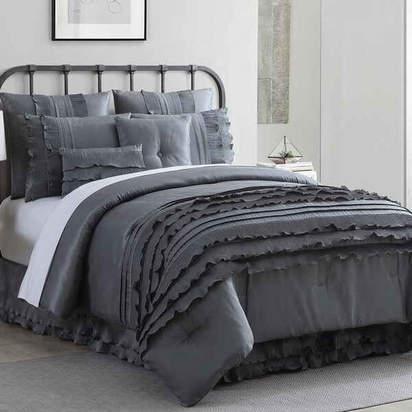 Update your bedroom with this soft and attractive eight-piece comforter set. The polyester filling gives just the right fluffiness to this comforter set while the bar tacking details give a more formal finished look. This set includes embroidery-detailed euro shams, decorative pillows, pillow shams, and a tailored bed skirt, not to mention an oversized, overfilled comforter wrapped in 100-percent polyester.