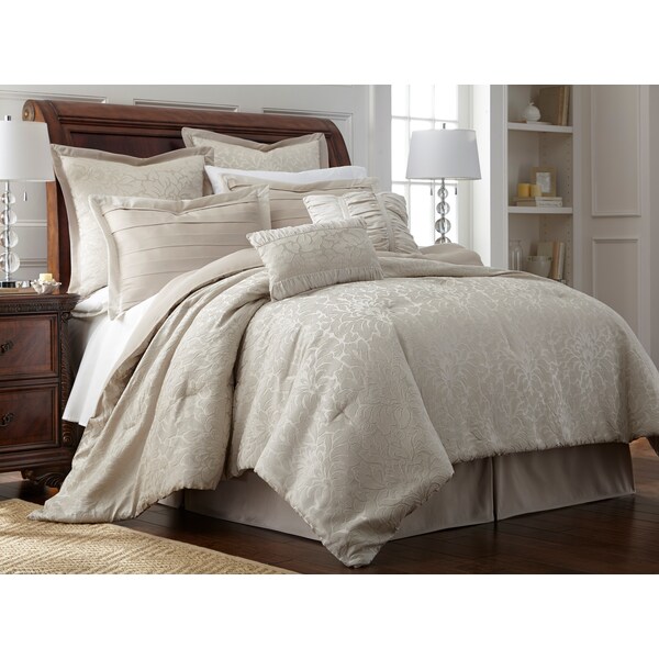 Update your bedroom with this soft and attractive eight-piece comforter set. The polyester filling gives just the right fluffiness to this comforter set while the bar tacking details give a more formal finished look. This set includes embroidery-detailed euro shams, decorative pillows, pillow shams, and a tailored bed skirt, not to mention an oversized, overfilled comforter wrapped in 100-percent polyester.