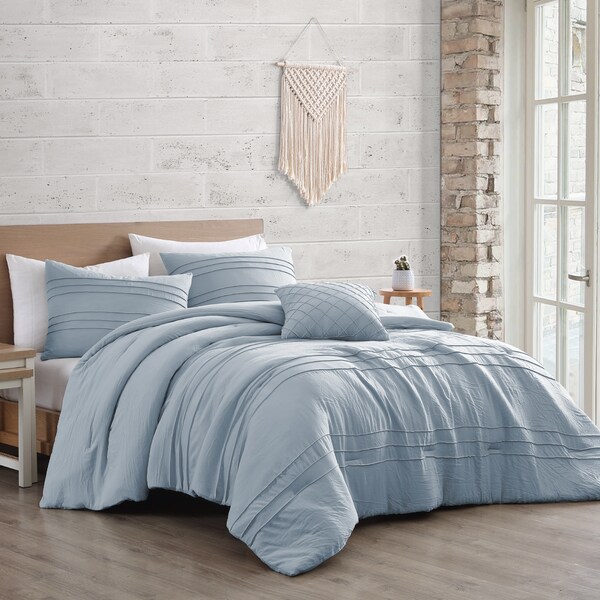 Everyone is craving soft texture and easy living these days; a relaxed atmosphere that allows us to take a deep breath! Taylor bedding set is available in two trendsetting colors that will suit any style of living. - A beautiful blue and Sage for a deep rich look- pair your favorite colors here to create a look that fits your personality! The four-piece bedding set comes in a reusable self-bag, that can be used for years to come for all your toting needs - whether it is a weekend overnight, beach bag, shopping bag - a sustainable solution to packaging. This set includes a solid comforter made of washed microfiber, two matching shams and a 12 x 18 rectangle decorative pillow with pleating for an added touch. Easy care microfiber and the soft hand of the fabric make this a must have!