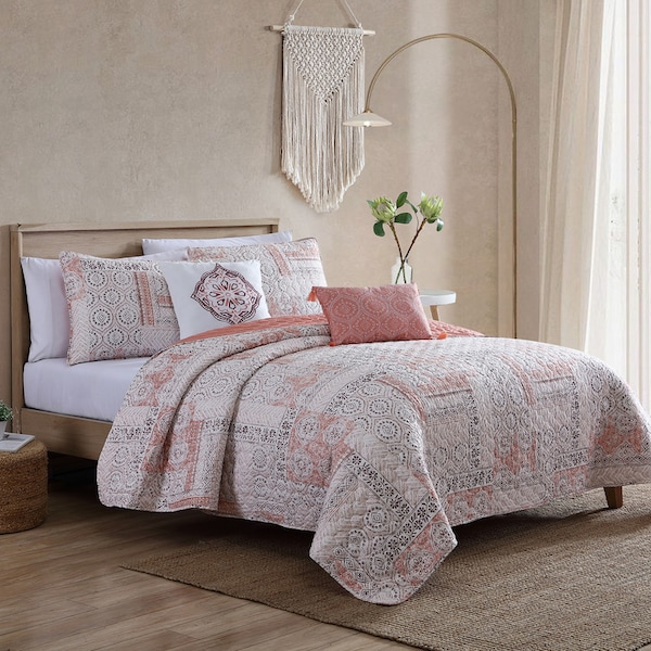 Brighten up any bedroom with this colorful quilt set. The set includes a quilt, two shams and two pillows for a totally harmonized design. Mix and match the solid and patterned pillows against the solid or patterned side of the reversible quilt to create different coordinated looks. The super-fine fibers that make up our quilt are densely packed into the fabrication of the quilt, making it extra fuzzy and soft. Extra lightweight brings you feeling of comfort and freedom. Made of 100 percent polyester, the quilt is machine washable for easy cleaning.
