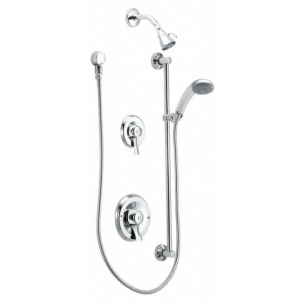 Shower Faucet, ADA Compliance Yes, Non CEC Compliant, Connection Size 1/2 in, NPT, Face Shape Circle, Faucet Handle Type Lever, Fixed Showerhead Flow Rate 2.5 gpm, Handheld Showerhead Flow Rate 2.5 gpm, Handheld Showerhead Thickness 3 3/8 in, Handheld Showerhead Width 3 3/8 in, Handle Length 3 1/2 in, Number of Handles 2, Moen, Commercial Series, Shower Connection Type 1/2 in Male NPSL, Shower Valve Type Pressure Balancing, Showerhead Function Single, Showerhead Material Metal
