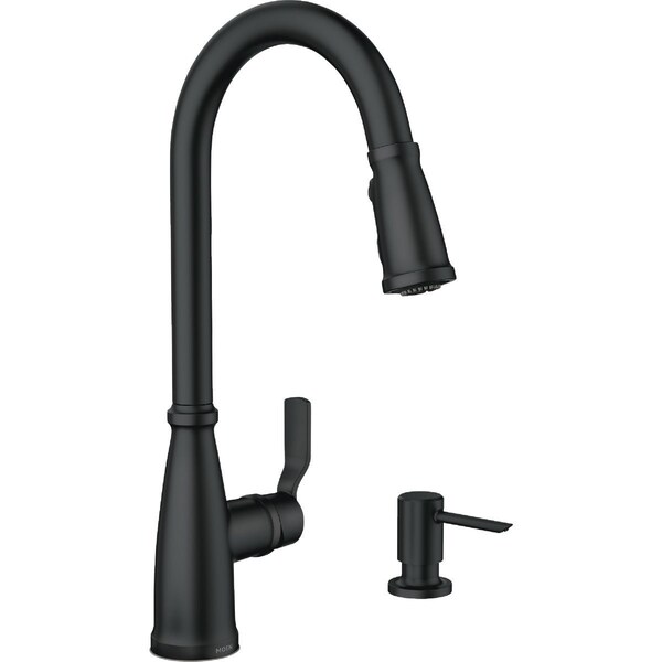 The Nolia pulldown kitchen faucet boasts a fresh take on classic styling that works well with various kitchen decor preferences. The four-function pull-down wand includes Moens PowerBoost technology which provides a faster clean and a faster fill than Moen faucets without the technology - all with the push of a button. Features the Reflex system to ensure smooth operation and secure docking of the spray wand. It also comes with a coordinating soap dispenser.