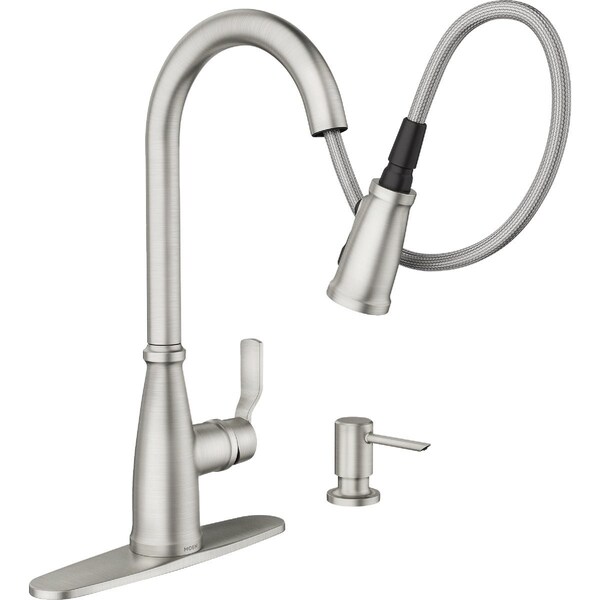 The Nolia pulldown kitchen faucet boasts a fresh take on classic styling that works well with various kitchen decor preferences. The four-function pull-down wand includes Moens PowerBoost technology which provides a faster clean and a faster fill than Moen faucets without the technology - all with the push of a button. Features the Reflex system to ensure smooth operation and secure docking of the spray wand. It also comes with a coordinating soap dispenser.