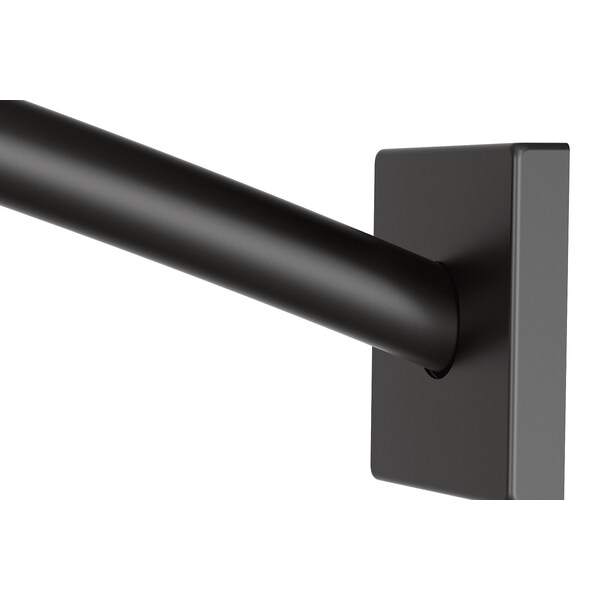 The MOEN Triva Adjustable Curved Shower Rod has a matte black finish, a length of 33 inches, a weight of 2.121 pounds, a height of 2.75 inches, and a width of 1 inch. It is part of the Triva collection.