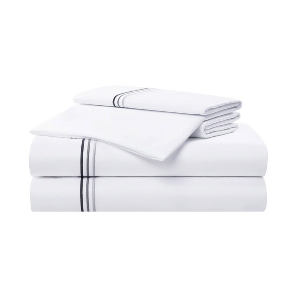 ALLURING ELEGANCE: Tri-tone embroidered Baratta hem creates a striking accent on immaculate white sateen cotton bed sheets. With five elegant color palettes to choose from, you will find the perfect luxury sheet set for your stylish bedroom. This luxury sheet set includes one flat sheet, one fitted sheet, and two pillowcases. SILKY SMOOTH TO THE TOUCH: Aston & Arden Signature 600 Thread Count Sateen Sheet Setsft soft, smooth surface has a smooth hand feel. Sateen cotton sheets are naturally wrinkle-resistant, as the threads are tightly woven, which gives them a more formal look than sheets of lesser quality. Heavier than most cotton sheets, this set is ideal for year-round comfort. SUPERIOR ULTRAFINE COTTON: Each Aston & Arden sateen sheet is woven from a rare, hand-picked, long-staple cotton. Each cotton plant is carefully picked, spun, woven, and finished by master craftsmen backed by a highly reputable mill with over 75 years of experience weaving fine linens. Choose from an elegant line of fine hotel-quality sheets and pillowcases. CRISP WHITE SHEETS WITH FINE DETAILS: This collection features pure white sheets with contrasting embroidered border details - three shades of fine embroidered stripes with establishing colors of Fawn Beige, Lapis Blue, Onyx Black, Dove White, and Stone Grey. Make a sophisticated decor statement with distinguished bedding and textiles from this refined sheet set collection from Aston & Arden. ENVIRONMENTALLY & HUMAN FRIENDLY: Our sheets are woven in an Oeko-Tex Standard 100 certified facility to be free from harmful chemicals. Treatment plants reuse nearly 99% of all water, while 70% of all energy is wind-generated. Our mill provides housing, education, and access to healthcare to empower employees. You'll gain peace of mind and sleep in comfort knowing that you purchased ethically sourced bed linens