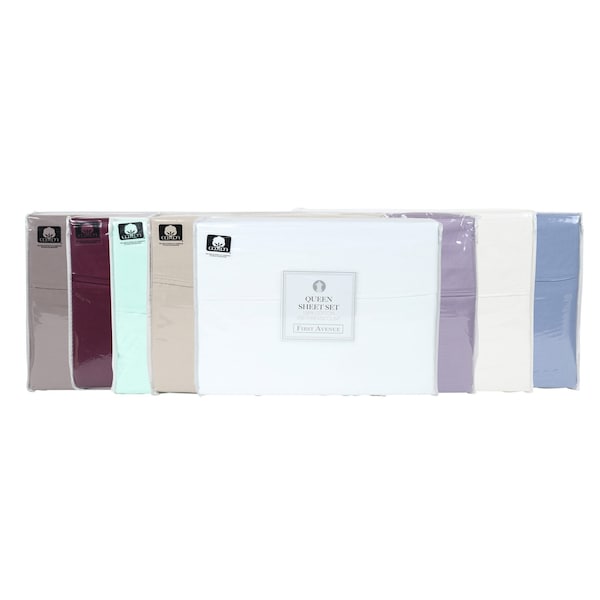 VARIETY ASSORTMENT: First Avenue sheet four-piece sets are an assortment of seven popular trending colors. Made from 100% cotton, each sheet has a 300 thread count. Each sheet set is neatly presented in a clear plastic zippered bag with a decorative product information card. This quality collection is strongly suited to buyers for retail operations but is value-priced to be equally attractive to property managers of any rental space, school, dormitory, camp, shelter, or living space. ASSORTED COLORS: A bulk case of First Avenue sheets contains 4 four-piece sets. Assorted trending colors may include white, ivory, taupe, grey, blue, sage, and navy. As trends change colors may change. 300 THREAD COUNT: Our First Avenue line of sheet sets are hotel-quality linens with a 300 thread count. These 100% premium cotton sheets are available in full, queen, and king-size sets. BULK CASES: Buy a case of 4 hotel-quality sheet sets. Each case contains 4 four-piece sets. Institutional buyers and property managers for multiple vacation rentals or short-term residences can increase their value when they buy by the case. Low minimums make it easy to create a professional presentation for any bedroom space. MACHINE WASHABLE: Machine wash colors in cold water, Tumble dry on a low heat setting. Never use bleach or fabric softener on sheets