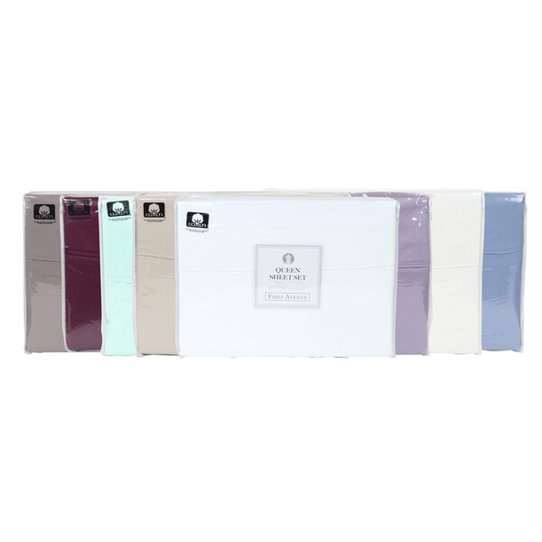VARIETY ASSORTMENT: First Avenue sheet four-piece sets are an assortment of seven popular trending colors. Made from 100% cotton, each sheet has a 300 thread count. Each sheet set is neatly presented in a clear plastic zippered bag with a decorative product information card. This quality collection is strongly suited to buyers for retail operations but is value-priced to be equally attractive to property managers of any rental space, school, dormitory, camp, shelter, or living space. ASSORTED COLORS: A bulk case of First Avenue sheets contains 4 four-piece sets. Assorted trending colors may include white, ivory, taupe, grey, blue, sage, and navy. As trends change colors may change. 300 THREAD COUNT: Our First Avenue line of sheet sets are hotel-quality linens with a 300 thread count. These 100% premium cotton sheets are available in full, queen, and king-size sets. BULK CASES: Buy a case of 4 hotel-quality sheet sets. Each case contains 4 four-piece sets. Institutional buyers and property managers for multiple vacation rentals or short-term residences can increase their value when they buy by the case. Low minimums make it easy to create a professional presentation for any bedroom space. MACHINE WASHABLE: Machine wash colors in cold water, Tumble dry on a low heat setting. Never use bleach or fabric softener on sheets