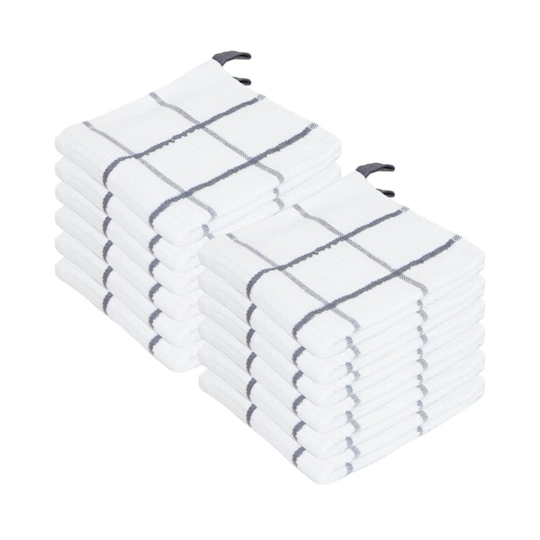 100% Cotton PREMIER DISHCLOTH QUALITY: The name says it all. These premium dish cloths are soft, highly absorbent, quick drying, and are made from 100% soft ring spun cotton. This 420 GSM terry kitchen dish cloth is manufactured for everyday use. DISH TOWEL MEASUREMENTS: Our dishcloths sets measure 13 by 13 inches and feature white kitchen towels with color accents. Our dish towels have a classic Windowpane design, making them very beautiful for any kitchen. The set of 12 dishcloths gives a streak free and lint free finish. DISH TOWELS WITH LOOPS: These decorative dish towel sets will add a touch of elegance to any decor and feature a dish cloth drying loop. Use in your home kitchen, bar, or dining room. Perfect for extended-stay suites, bed and breakfasts, and vacation home rentals. Pair with our kitchen towel sets to elevate your cleaning cloth style. MULTI-PURPOSE DISHCLOTHS: Our dishcloth and kitchen towel sets are ideal for drying dishes, glasses, plates, silverware, flatware and for cleaning the kitchen, bar tops and tabletops. Use as a dish drying cloth or even a cleaning cloth for house cleaning. These cleaning cloths are thick and large in size thus making them perfect for use as regular dish cleaning cloths. CARING FOR YOUR KITCHEN AND DISHCLOTHS SETS: Our dish cloths and kitchen towels are machine-washable. For best kitchen dish towel longevity, do not use harsh chemicals or bleach when washing and tumble dry low. They can be washed and reused many times without losing their absorbency or softness