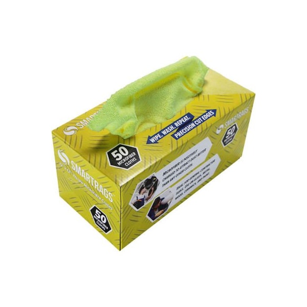 Smartrags microfiber cleaning cloths, 12" x 12", yellow, 50 rags/box - m950y smartrags are the smarter tool for all tasks. Each dispenser box contains 50 12"x12" microfiber cloths with precision cut seamless edges. Color-codingreduces the threat (and perception) of cross-contamination. Smaller and more compact than regular microfiber cloths, smartrags are ideal for utility carts, corporate supply rooms, automotive shops, and break rooms. Smartrags are less expensive than regular microfiber cloths so are ideally used in high-loss environments: industrial and automotive shops need better lint-free options to wipe away heavy grime and oil. office environments value the compact consumer-friendly packaging. employees are also prone to wipe-and-toss rather than launder cloths. healthcare facilities are hyper sensitive to hospital acquired infections (hais) so cloths are often discarded after one use.