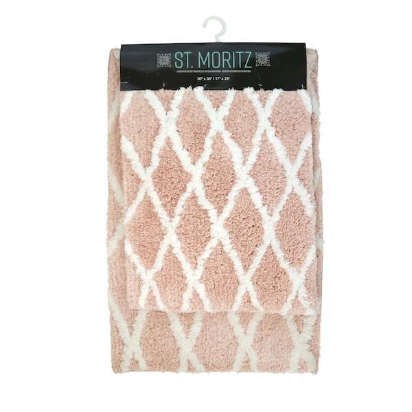 St. Mortiz 2-Piece Bathroom Rug Set, 17X23 & 20X30, Color Ground with Criss Cross Pattern, Color Options St Mortiz rug sets are made with 100% microfiber and have latex or spray latex backing. These rugs have 4 solid color options, and include a modern sleek header card that presents these rugs beautifully. Each set of 2 contains 1 rug that is 17x23 in., and another that is 20x30in