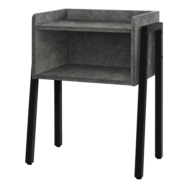 Save space while providing the perfect sidekick to any furniture ensemble. This end table, featuring a grey stone-look, is equipped with an open shelf and modern black metal legs to complete the industrial-inspired design. Made for showing off your favorite decor items or storing books in the living room or family room, this side table can also be used as a bedside table. It is an on-trend piece that is waiting to be added to any living space. Assembly is required.. Sleek and airy side table with an open shelf cubby for the display or storage of books, photo frames and other decorative objects. This rectangular end table features a smooth grey stone look on all sides. Perfect multi-use display unit for the living room, bedroom, family room, or as a nightstand/lamp table. This small modern accent table is supported by sturdy black metal legs.