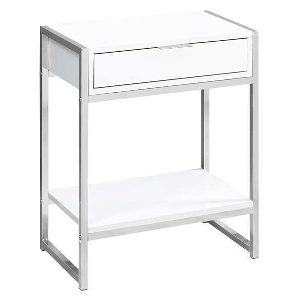 Add instant style to a room with this contemporary multi-functional side/end accent table. It features a spacious rectangular table top with an elegant glossy white finish and one large storage drawer on metal glides with a simple silver metal handle on top. The open bottom shelf in the same finish is handy to store or display more items and the simple square chrome metal supports tie it all together for in an effortless design. Bring this accent table into the bedroom as a chic nightstand, place it next to your modern sofa or arm chair as a useful side table. The compact size also makes it ideal for smaller spaces. Assembly is required. Spacious rectangular table top finished in a smooth glossy white. One large storage drawer with a discreet silver metal drawer pull. Open bottom shelf to store or display additional objects. Clean lined chrome metal base and frame for an effortless contemporary design.