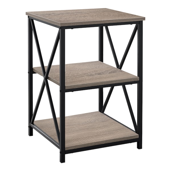 This simple, contemporary style end table with an industrial look is a multi-functional accent piece suitable for any room. The stylish black metal legs with an X design on the two sides, contrasts with the warmth of the dark taupe wood look laminate square tops. The two open bottom shelves offer a convenient storage space for books, magazines, or decorative objects with room on top for a small lamp or a place to set down your drink. Bring it into the bedroom as a sleek and compact nightstand for a clean modern touch. Assembly is required.. Chic side table in a simple, modern industrial design convenient for a living room or bedroom. Elegant black metal legs with contrasting, smooth dark taupe, wood look laminate tabletops. Two open bottom shelves perfect for storing books, magazines, or display decorative objects. Compact size accent table ideal for small contemporary spaces.
