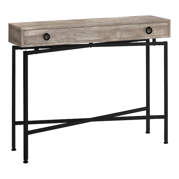 Add a touch of contemporary styling to your home with this taupe reclaimed wood-look console table. Ideal for entryways, hallways or anywhere you would like to showcase your favorite accent pieces, this table will blend seamlessly with any decor. Featuring a sturdy black metal base and a chic brown reclaimed wood-look top, with a large storage drawer, this fashion-forward piece will provide years of lasting enjoyment.. Contemporary barn style finish in a taupe reclaimed wood-look accented with round black metal pulls. Large storage drawer for your keys or mail. Sturdy yet stylish black metal base. Can be used in your entryway, hallway or living room.