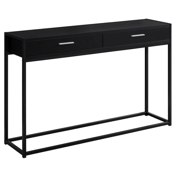 Boost the look of your entryway, hallway, living room or office space with this modern style, rectangular console accent table with a chic industrial vibe. Made with high quality MDF material, the smooth laminated black top blends into the solid black metal square base with its clean minimalist lines. The two handy storage drawers on metal glides are perfect to store keys and paperwork, while the spacious table top can hold books, pictures, decorative objects, or a lamp. This versatile and functional console table will be the most useful furniture piece in your home today! Assembly is required.. 2 large storage drawers on metal glides with sleek silver metal handles. Sturdy black metal legs in a minimalist style. Multi-functional console table ideal even for small spaces. Contemporary industrial design.