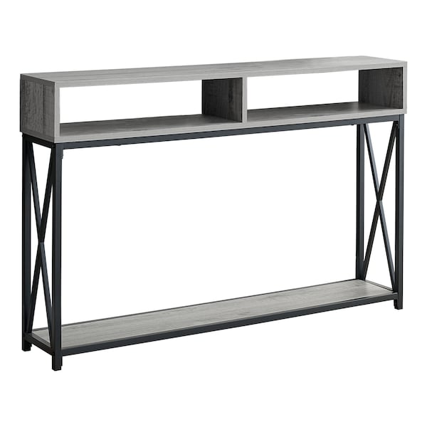 Adding plants, baskets, books or other decor items to the entryway, living room or bedroom? Featuring 2 open shelves, this console table is a stunning combination of grey wood look tones with a sturdy X-design black metal frame to pair with any style. Also including a bottom panel for additional space, this accent table is your versatile storage solution at a perfect height and compact design to bring an edge to your small home, apartment or condo. It will look fabulous anywhere!. Durable wood look surface with a contemporary grey finish. This console table is supported by a strong black metal X design frame. Perfect entryway table or accent table for the hallway, living room, bedroom or office. Two open-concept storage shelves and bottom shelf for the display of books or other accent decor items.
