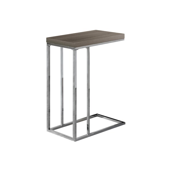 For a brilliant home upgrade, this dark taupe wood look C shape side table does the trick. Supported by an elegant chrome metal base, the end table is made for anything from snacks and drinks to your laptop, tablet and even decorative accents that complement the rest of your decor. Bringing a modern touch to your small home, condo or apartment, this C table slides nicely under the couch or bed. Study session? Favorite movie? Quiet reading time? This side table handles all of the above.. Bring a wood look tone to your living room, office space, family room or den with this stylish dark taupe wood-look / chrome metal C end table. Use it conveniently as a snack table or sofa side table. With a trendy wood textured surface, this C shape side table slips easily under your sofa, chair or bed and sits slightly off the ground to prevent damage to your floor. Solid chrome metal base delivers optimal stability.