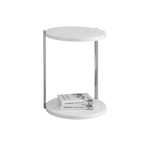 To have or not to have just isn't a question! This stylish glossy white round accent table offers a simple yet convenient place to put down your drinks, snacks, meals or even a tablet while lounging on your couch or entertaining. The sturdy yet fashionable chrome metal supports with an extra shelf at the bottom provide additional storage for this must-have table. Use this versatile contemporary snack and accent table for your living room, office space, family room or den.. Sturdy and stylish chrome metal supports. Top and base finished in a rich glossy white. Ample surface area for a tablet, meals, snacks, or drinks. Open bottom shelf for additional storage.