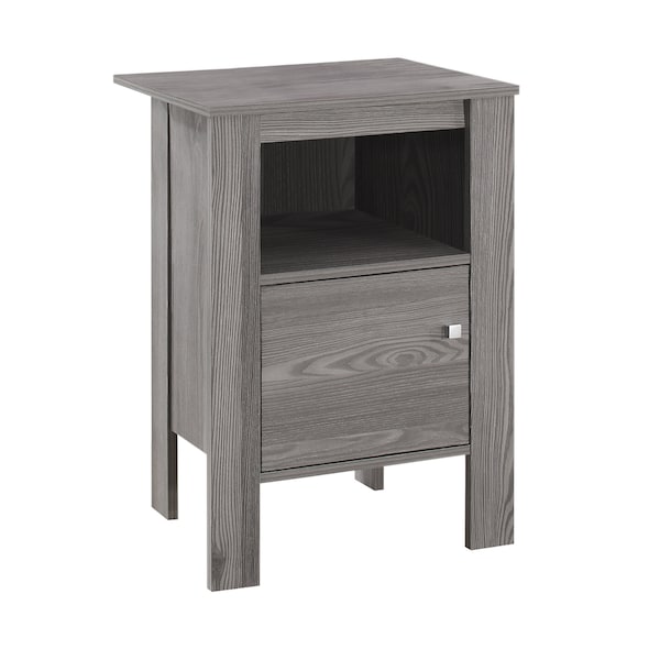 Bring an industrial and contemporary design together with this handsome grey wood-look night stand that can also be placed beside the couch as an end table or accent table. In a compact format, it has ample surface space for a few decorations, books or a laptop/tablet thanks to an open shelf and closed cabinet with a beautiful square silver knob. Make your small home, apartment or condo feel nice and homey and draw some attention to your stylish new side table.. Displaying a classic and natural feel simultaneously, this night stand / bedside table can also easily act as your end table or accent table. Finished in a beautiful grey wood look for a warm tone that will draw attention to your stylish living room, bedroom, family room, or den. With a touch of rustic, this practical side table features ample surface space thanks to an interior open shelf and closed cabinet with an elegant square silver knob. Sturdy square legs ensure stability; floor protectors included.