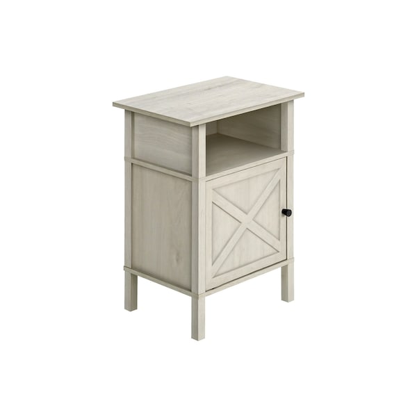 Upgrade your living room or bedroom with this versatile side accent table. Standing at 24" tall, this stylish side table features a warm washed oak laminate finish on all sides, complimented with a classic black metal knob on the cabinet door. The durably designed construction ensures longevity, while the easy to clean top makes maintenance a breeze. With a practical open shelf and spacious closed cabinet for plenty of storage, this accent table is perfect for small rooms with its space saving design that is both functional and fashionable. Easy to assemble with illustrated instructions and floor protectors included, ready to setup and enjoy in no time.