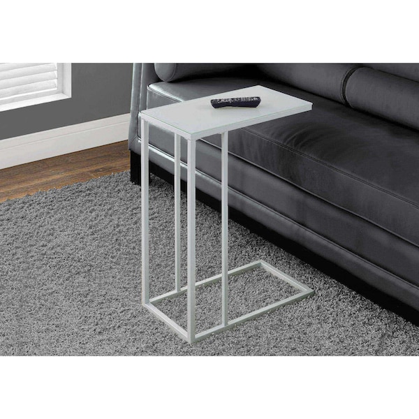 A perfectly tapered accent table that fits independently with any furniture in your home, this rectangular table features a frosted tempered glass surface perfect for you snacks, drinks, meals or tablet. The white metal base easily slips under a sofa or chair and provides sturdy support along with a fashionable touch that will suit any decor. A multi functional accent piece ideal for a living room, family room, den, home office.. Chic rectangular frosted white tempered glass top. Ample surface area for your snacks, drinks, meals, or tablet. Can be used as an accent or snack table. Sturdy stylish white metal base.