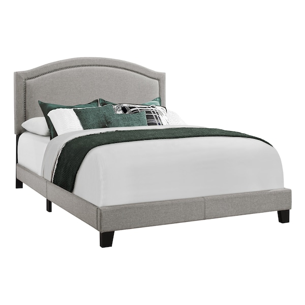 Add style, elegance and a comfortable element to your bedroom with this contemporary designed queen size bed frame. Featuring a chic grey linen fabric and stylish chrome metal nailhead trim outlining the curved headboard, this bed will surely be the focal point of any bedroom. The box spring and mattress is not included and must be purchased separately. We recommend a 2 inch low profile box spring. All parts and hardware for assembly are conveniently located inside the headboard.. Upholstered headboard, side and end rail in a chic grey linen-look fabric. Arched silhouette with chrome nailhead trim that compliments any bedroom decor. Requires a standard queen sized box spring and mattress (not included). Supports up to 600 lbs. Accented with black solid wood block feet